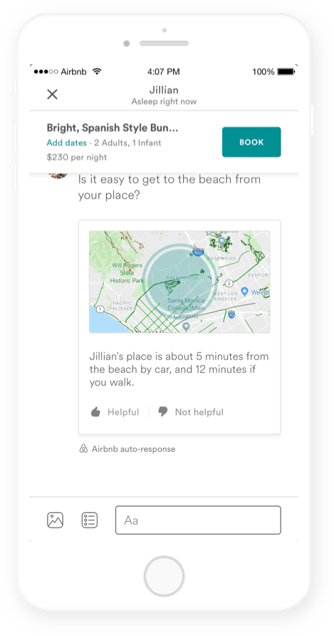 A guest can tap on a question to receive an auto-response from airbnb. Reveal answers to commonly asked questions that are relevant to the booking and the trip